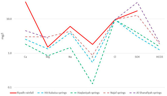 To better understand the factors responsible for the chemical composition of the spring water, a standardised Schoeller plot was constructed (Figure 7), comparing the median major ion chemistry of the springs with that of the nearest available rainfall data on the desert plateau at Riyadh [34] (Table 1); all data were standardised to the Cl− value of the rainfall to remove any influence of evaporation. Using median compositions illustrates overall trends, on which processes specific to particular spring groups are superimposed, causing the variability in the composition evident for the Hit-Kubaysa and Najaf springs (Figure 6), as discussed further below.