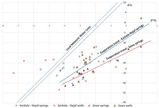 The above discussion shows that the species in the spring waters were derived either from rainfall, rock–water interaction within the aquifers, or, in the case of some Hit-Kubaysa springs, oilfield brines. Al Dahaan [10] and al Dahan et al. [11] hypothesised that there was also a contribution of connate seawater originally deposited with the marine carbonates of the aquifers. However, the aquifer carbonates are strongly cemented and lack any significant original granular porosity where the connate groundwater could have been stored. In any case, the maximum groundwater ages on the Arabian Peninsula are only 20,000–30,000 years [44,50], indicating that any connate seawater was flushed from the aquifers long ago. Furthermore, the stable isotope composition of the springs (Figure 9) is consistent with an origin entirely from rainfall. The stable isotope composition of seawater is around 0 for both δ18O and δ2H, and although there is one spring sample with stable isotope values close to this, it has undergone considerable evaporation [7]. The spring samples plot on the evaporation trends (Figure 9), because the spring flow rates are mostly slow enough to allow for significant evaporation soon after the spring water has reached the surface. Groundwater stable isotope data from nearby wells within the carbonate aquifers are mostly located to the right of the Local Meteoric Water Line (LMWL), indicating some evaporation during recharge. A few data lie to the left of the LMWL; this groundwater could have been recharged under a previous wetter climate, e.g., the relatively wet ‘Pluvial Period’ from 9500 to 5000 years ago [44,50].