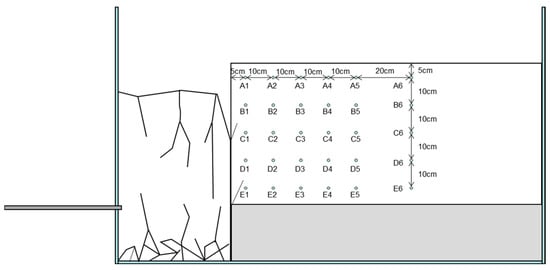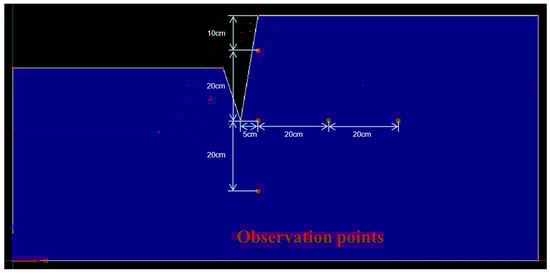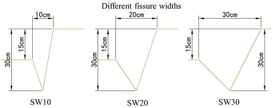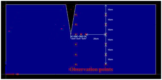 As shown in Figure 7, the fissure models SW10, SW20, and SW30 were established, with corresponding fissure widths of 10, 20, 30 cm, and the depth of the fissures was uniformly set at 30 cm. In contrast to the planar fissures, we increased the spacing of observation points and added three observation points at the same position 5, 25, 45 cm below the bottom of the fissure. Taking SW10 as an example, the location of the observation points is shown in Figure 8.