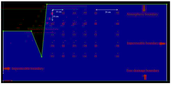 The HYDRUS numerical model was created based on the measured fissure morphology. As shown in Figure 2, the boundary of the fissure simulation device was in contact with the atmosphere, so the upper boundary of the HYDRUS model was set as an atmospheric boundary. The lower boundary of the HYDRUS model was set as a free drainage boundary, while the left and right sides were designated as impermeable boundaries.