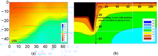 Comparison of soil moisture distribution between physical test and HYDRUS simulation. (a) Moisture of physical test. (b) Moisture of HYDRUS simulation.