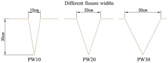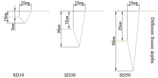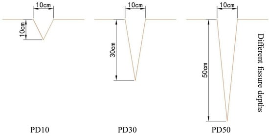 As shown in Figure 6, fissure models PD10, PD30, and PD50 were established, with corresponding fissure depths of 10, 30, 50 cm, and the fissure width was uniformly set to 10 cm. We added observation points at distances of 10, 30, 50 cm from the ground near fissures PD10, PD30, and PD50. As PD30 and PW10 models are the same size, the positions of the observation points are shown in Figure 5.