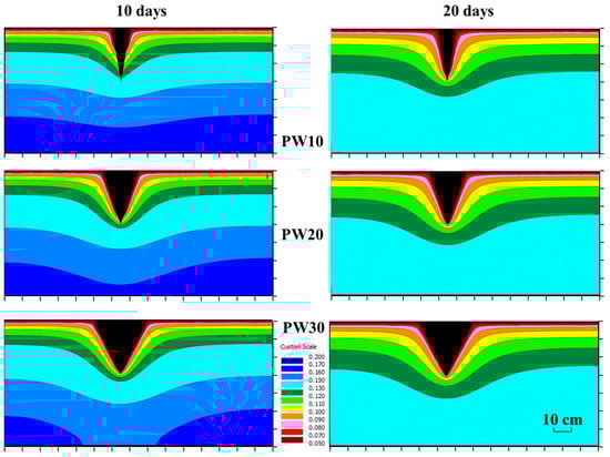 The soil moisture content varies depending on the distance from the soil surface and the width of the fissure. As shown in Figure 10, the soil moisture content decreases as the distance to the soil surface or the fissure decreases. Additionally, the effect of fissure width on soil moisture-content reduction varies. For the range of moisture content from 11% to 12% observed on the 10th day, it is evident that the light-green moisture range of the narrowest fissure, PW10, has not yet reached the bottom of the fissure, while the mid-width PW20 has just reached the bottom, and the widest fissure, PW30, has already exceeded the bottom depth. This indicates that wider fissures have a greater reduction in soil moisture content and a more significant effect. Horizontally, the impact range increases with fissure width: PW30 > PW20 > PW10. By the 20th day, the spatial distribution of soil moisture for fissures PW20 and PW30 is similar, but the soil moisture content of PW30 is lower relative to PW20. However, PW10 still shows significant differences compared to the previous two fissures.