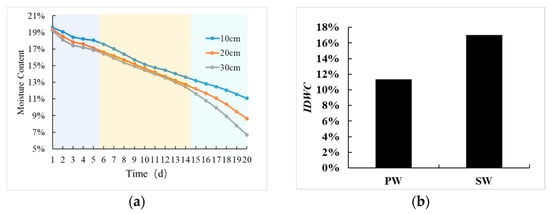 The graph depicted in Figure 11a illustrates the fluctuation in soil moisture content at the bottom of a fissure. It is evident that from the first to the fifth day, PW30 had the lowest moisture content, followed by PW20, which had less moisture than PW10. From day six to day fourteen, PW20 and PW30 remained relatively close and significantly lower than PW10. From day fifteen to day twenty, PW30 again had the lowest moisture content, followed by PW20 and then PW10. The minimum soil moisture contents recorded for PW30, PW20, and PW10 were 6.7%, 8.6%, and 11.1%, respectively. The reduction in soil moisture content in PW30 compared to PW10 was 39.6%, indicating that wider fissure widths may result in more rapid soil moisture loss. Figure 11b demonstrates that the IDMC of the fissure-bottom monitoring point for the planar fissure is 11.36%, which suggests that the fissure width has a considerable impact on soil moisture loss in that area.