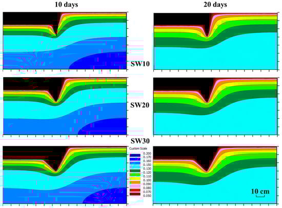 Concerning the impact of stepped fissures of varying widths on soil moisture transport, as depicted in Figure 12, fissures accelerate the loss of soil moisture, and the range of soil moisture affected in the upper and lower strata is not symmetrical. The wider the stepped fissure, the greater the acceleration effect of soil moisture loss. On the tenth day, the range of moisture content between 9% and 10% had not yet reached the depth of the bottom of the fissure for PW30, while PW20 had already reached the bottom, and the widest fissure, PW30, had already exceeded the depth of the bottom. By the twentieth day, the spatial distribution of soil moisture for PW20 and PW30 was similar, but PW30 had slightly lower soil moisture content compared to PW20. In contrast, PW10 still showed significantly lower soil moisture levels compared to the other two fissures.