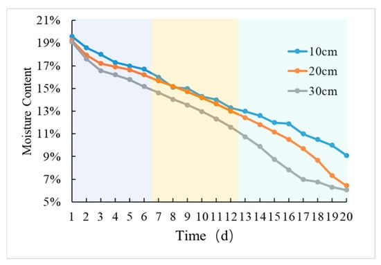 The initial soil moisture content of the HYDRUS model was set to the average initial moisture content of the measured data, which was 19.7%. The hydraulic properties of the soil were obtained based on the measured data and are presented in Table 1.
