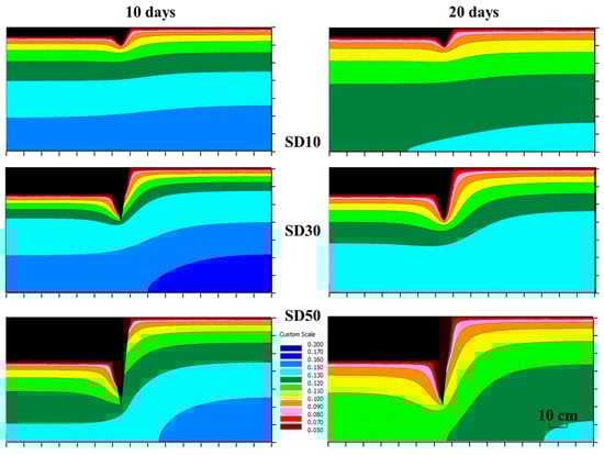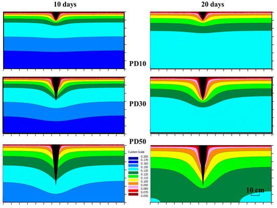As shown in Figure 14, the influence of fissure depth on soil moisture is more extensive than that of width. The deeper the fissure, the greater its impact on soil moisture. On the tenth day, PD50 has a significant effect on the moisture content of deep soil, and the soil moisture contour shows a noticeable curve. The impact depth of PD10 is primarily within a range of 15 cm on the surface. Over time, within 20 days, the impact depth of PD50 far surpasses the depth of the fissure itself, while the soil-moisture impact depth of PD30 reaches approximately 40 cm, and PD10 exceeds 20 cm. In the horizontal direction, it can also be observed that the wider the fissure, the greater its range of influence.