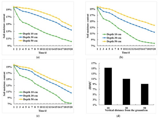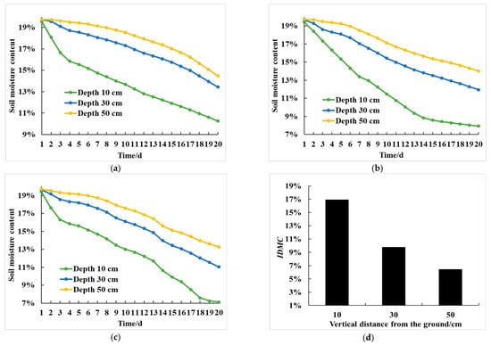 Figure 15 illustrates the soil moisture variations at different monitoring depths for ground fissures. As depicted in Figure 15a–c, each fissure demonstrates a trend in which the deeper the soil depth, the slower the soil moisture loss is. Compared to PD30 and PD50, the soil moisture-content decline curve of PD10 is notably more gradual, especially at a depth of 50 cm, where the moisture decline is significantly reduced, and the soil moisture-content curve is nearly flat. On the 20th day, the soil moisture content at different depths was found to be PD50 < PD30 < PD10. Specifically, the soil moisture content at PD50 was lower than PD10 by 30.6%, 17.8%, and 8.4% at depths of 10 cm, 30 cm, and 50 cm, respectively. Additionally, as depicted in Figure 15d, the IDMC at all depths was above 6%, with the highest value at a depth of 10 cm, reaching 16.9%. This indicates that the depth of fissures has a substantial impact on moisture loss at various monitoring locations, and the deeper the soil, the lesser the impact.