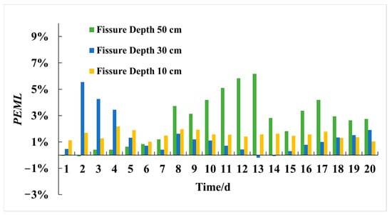 As depicted in Figure 18, PEML typically presents positive values, with only a few cases of negative values that do not surpass 1%. This suggests that stepped ground fissures of the same size have a more significant impact on soil moisture loss compared to planar fissures. By evaluating the PEML values of three distinct-sized fissures, it becomes apparent that the larger the fissure scale, the higher the PEML. This implies that under large-scale fissuring, the soil moisture-loss effect of stepped fissures is significantly greater than that of planar fissures.