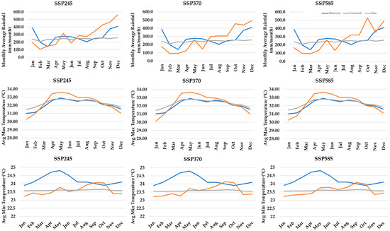 Figure 3 displays the bias-correction result, indicating that the ensemble monthly historical CMIP6, after bias adjustment, generally matched the observed precipitation and temperatures.