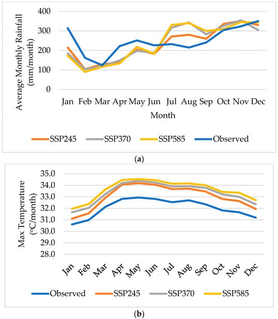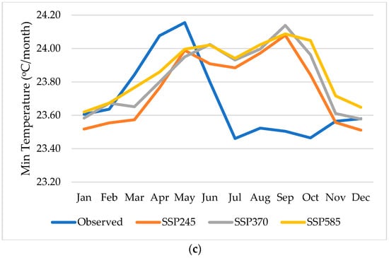 Figure 4c, the average minimum temperature will have more significant changes, where an increase in the average minimum temperature between 0.4 °C and 0.6 °C is seen starting from July to October under all scenarios, while the rest of the months it remains closer to that which was observed. Overall, a rise in both the average minimum and maximum temperatures is anticipated in the off season.