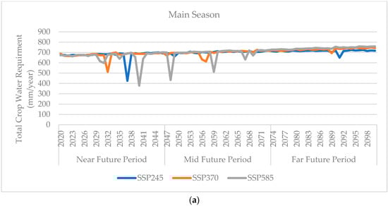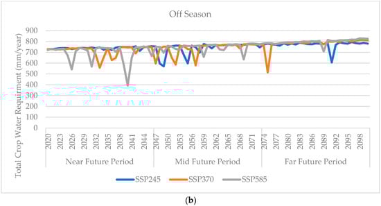Figure 5 shows the total crop water requirement annually for (a) the main season and (b) the off season. The lowest total crop water requirement for the main season is 513 mm/year in 2032 under SSP245, 426 mm/year under SSP370, as well as 379 mm/year, 433 mm/year, and 513 mm/year in the 2040, 2048, and 2059, respectively, under SSP585. As for the off season, the total crop water requirement shows more frequent variation than the main season. The total crop water requirement of the off season has more variation than the main season, especially during the mid future period under SSP245 and SSP370. This variation is mostly a reduction in the crop water requirements, reaching a minimum of below 600 mm/year (as low as 392 mm/year in the near future).