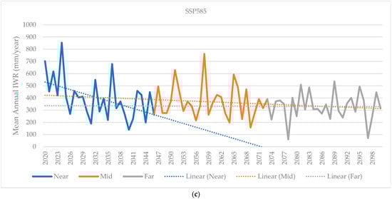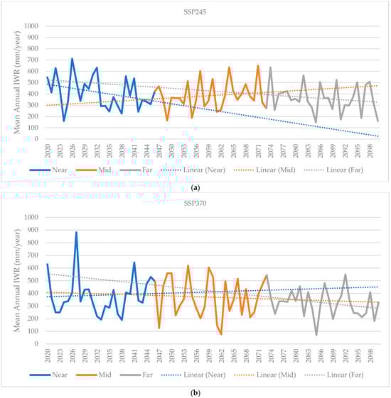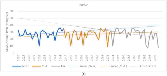 Figure 7a,b, show a declining trend under all scenarios in comparison to the main season. The mean annual IWR during the mid-future period under SSP245 expects an increasing trend.