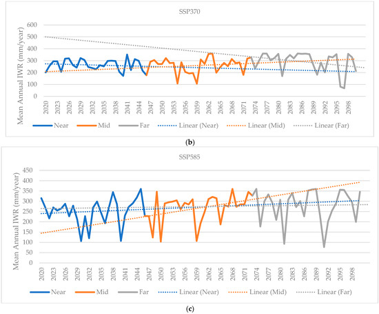 Figure 6a,b presents the annual trend of the predicted mean irrigation water requirement for the main season throughout the near future, mid future, and far future periods. Under the SSP245 scenario, an upward yearly trend is observed for the near and mid future periods, but the annual mean IWR has a declining trend within the far future period. The mean annual IWR under SSP370 started off with a steady trend during the near future period, and the annual trend of IWR increases in the mid future but decreases towards the end of the century. The annual mean IWR of the main season under SSP585 shows an increasing trend under SSP245 and SSP370. A steady trend in IWR during the far future period is observed, possibly due to the higher average rainfall under SSP585 and the therefore more excess rainfall to compensate for evapotranspiration. This could lead to potential waterlogging and increased runoff.