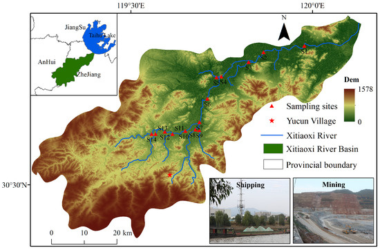 Located in the upper reaches of the Taihu Lake Basin (Figure 1), the Xitiaoxi River serves as a vital water source for Taihu Lake. Originating from the north slope of Tianmu Mountain, it traverses through mountainous terrain characterized by high peaks and deep valleys before coursing southwest to northeast through Anji County. The river spans a total length of 145 km, with a basin area covering 2274 km2. The gradient of the river varies from steep to gradual as it flows from Ancheng to Meixi, marking a transitional zone. Beyond Meixi, the channel slope gradually decreases, indicating a transition to a plain river. The natural difference in elevation along the river is of 297 m, with an annual runoff of 2.26 × 108 m3.