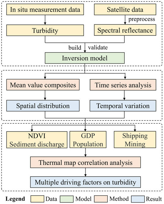 Framework for quantifying the spatio-temporal variation in turbidity and its drivers in the navigable and turbid river.