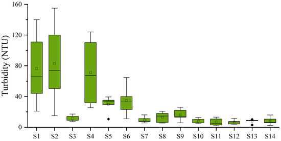 According to the survey findings illustrated in Figure 1, turbidity ranged from 2 to 155 NTU. Obviously, Downstream of Xitiaoxi River (S1), Gangkou station (S2), and Xiaoshugang station (S3) exhibited relatively high turbidity, with mean values of 76, 83, and 72 NTU, respectively. The downstream region, particularly the Gangkou station, experienced extreme turbidity due to sediment accumulation in the complex plain river network area. The frequent passage of ships at the Gangkou station stirred up suspended solids and sediment, contributing to the highest turbidity. In contrast, other monitoring sites exhibited average turbidity ranging between 7 and 34 NTU. These survey results vividly illustrate the turbidity disparities between the upper and lower reaches of the Xitiaoxi River, which reflects the suspended sediment in the river from the side (Figure 3).
