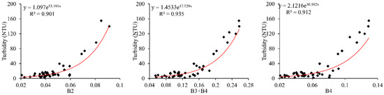 Following a correlation test of single bands and various band combinations, it was observed that the green band, red band, and near-infrared band are more sensitive and single bands 2 and 4, as well as the sum of bands 3 and 4 (Landsat 8), exhibit strong correlations with the measured turbidity. Based on these remote sensing factors, different index models were developed, yielding correlation coefficients of 0.901, 0.935, and 0.912, as depicted in Figure 4.