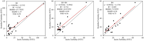 To directly compare the difference between the inverted turbidity and the measured turbidity, our study generated scatter plots using the inversion results from the three models alongside the measured results. Each scatter plot includes a linear regression fitting line (red line), fitting equation, a 1:1 line (dash line), and evaluation indices for scatter points (Figure 5.). Based on the model verification results, the model established using band 4 exhibits the best performance and superior fitting (R2 = 0.805, RMSE = 7.9 NTU, MAPE = 0.58, NSE = 0.75). Consequently, inversion models based on either band 3 (Landsat 5) or band 4 (Landsat 8) were determined, with the fitting equation given as y = 2.1216e0.502x.