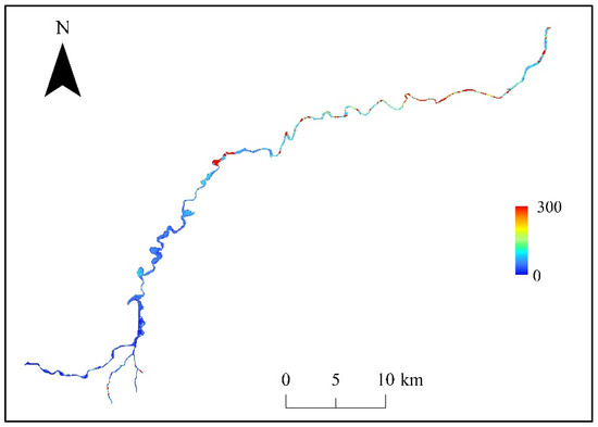 According to the established model, the turbidity of the Xitiaoxi River from 1984 to 2022 was inverted, and a spatial distribution map of the mean turbidity over the past 40 years was generated (Figure 6). Analysis reveals that water bodies with turbidity less than 50 NTU constitute 36% of the total area, while those with turbidity ranging between 50 and 100 NTU account for 38.7%. The remaining 25.4% of water bodies exhibit turbidity levels exceeding 100 NTU. Overall, turbidity tends to increase from the upstream to the downstream sections of the river, with clearer water observed in the upstream compared to the downstream sections. Particularly, the lowest turbidity value of 11 NTU is recorded in the upper channel of the river, while the highest value of 298 NTU is observed downstream, near Gangkou station.
