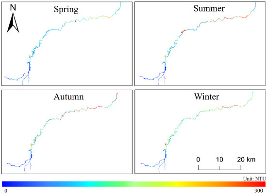 On a seasonal scale, the turbidity during spring, summer, autumn, and winter was also derived using the established model, and spatial distribution maps of seasonal mean turbidity were generated (Figure 7). The findings indicate consistently lower turbidity in the upstream compared to the downstream across all seasons. The average turbidity in the river during spring, summer, autumn, and winter was recorded as 93.9, 111.3, 113.5, and 120.9 NTU, respectively.