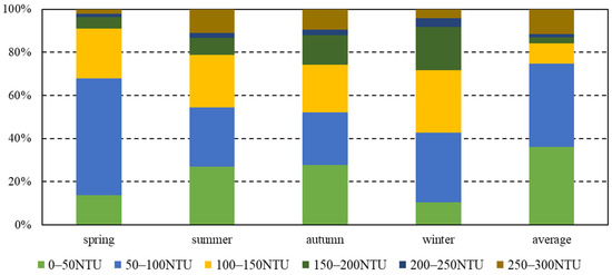 According to the statistical results (Figure 8), in spring, the turbidity of the river is the highest in the range of 50–100 NTU, accounting for 54.2%, followed by the water area with turbidity distribution in the range of 100–150 NTU, accounting for 23.2%. Turbidity below 50 NTU accounted for 13.7%, and turbidity above 150 NTU accounted for 9%. In summer, the distribution of turbidity across different ranges (0–50, 50–100, and 100–150 NTU) is relatively balanced, with proportions of 26.8%, 27.5%, and 24.4%, respectively. However, the proportion of water areas with turbidity exceeding 150 NTU increases significantly to 21.3%, twice as much as in spring. Similarly, in autumn, the distribution characteristics of turbidity in autumn mirror those in summer, with proportions of 27.7%, 24.3%, and 22.3% for the 0–50, 50–100, and 100–150 NTU ranges, respectively. Additionally, 25.7% of water areas exhibit turbidity exceeding 150 NTU. During winter, turbidity levels below 100 NTU account for 74.7% of the total, with 36% falling within the 0–50 NTU range and 38.7% within the 50–100 NTU range. Water areas with turbidity exceeding 150 NTU represent 15.8%, slightly higher than in spring.