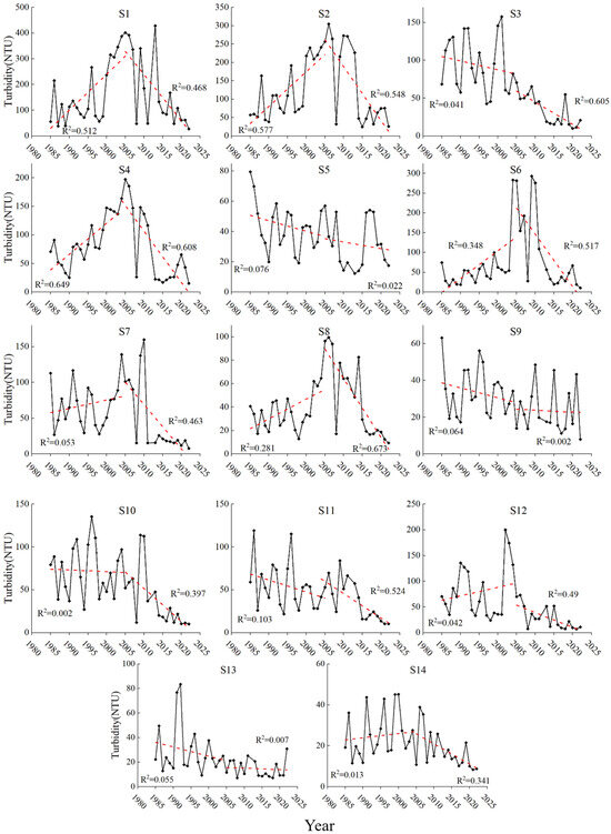 Figure 9 illustrates the trend in annual mean turbidity and the long-term time series at 14 monitoring points, with the dotted line indicating the trend in interannual turbidity change. The turbidity in Dipuxi River, Nanxi River, and the upper stream of Xixi River remain below 100 NTU throughout the year. This is primarily attributed to the steep upstream slope of the Xitiaoxi River, strong river scour and high vegetation coverage, particularly consisting of mountain forests, which contributes to clearer water conditions upstream. Statistical analysis reveals that turbidity fluctuations generally show an initial increase followed by a decrease. Data from eight monitoring points suggested that 2005 marked an inflection point in turbidity change. Before 2005, turbidity exhibited a fluctuating upward trend, followed by a fluctuating downward trend after 2005. Moreover, turbidity at all monitoring points displayed a fluctuating downward trend after 2005, possibly attributed to sand mining activities and subsequent mine rehabilitation efforts. Among the monitoring points, those in the upper reaches are less affected by human-induced sand mining activities, and the suspended sediment, aided by the steeper upstream slope, is less prone to settling. Conversely, monitoring points in the middle and lower reaches, particularly those in the main stream, are significantly impacted by sand mining activities, resulting in a pronounced change trend. Tributaries of the Xitiaoxi River are comparatively less affected by these activities.