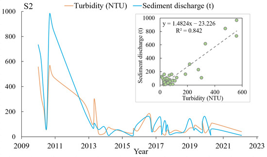 Correlation between turbidity and sediment discharge at Gangkou station (S2).