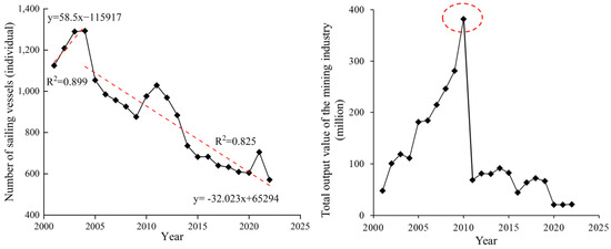 Trend of the number of sailing vessels (left) and total output value of the mining industry (right) in Xitiaoxi River.