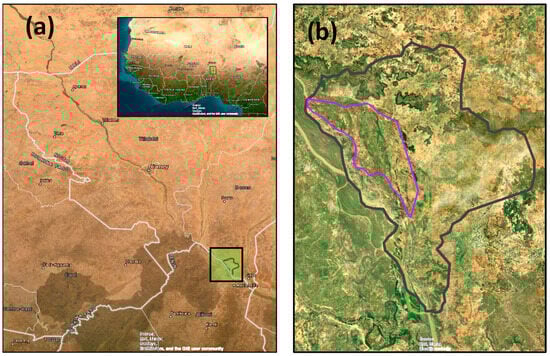 Maps showing: (a) the location of Sia Kouanza in the Sahel of southwestern Niger, West Africa; and (b) the outline of the model domain is in black, and the area of primary interest for development—the terrasse—is outlined in pink.