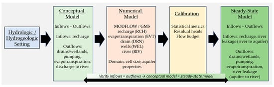Numerical models are useful tools for evaluating groundwater availability and sustainable use, understanding hydrogeological processes, assessing potential environmental impacts, and long-term planning [22]. While there is abundant literature describing their utility, it can be difficult to find procedures and details for model construction, especially when data are scarce. The approach employed here describes the hydrologic and hydrogeologic setting, development of a conceptual model, understanding the water balance, choice of numerical code, construction of a numerical model, calibration of that model, and interpretation of the calibrated steady-state model (Figure 2).