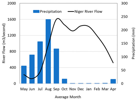 Surface water resources in the area are dominated by precipitation and the Niger River. Figure 4 shows average monthly river flow measured at the Malanville gauge, which is approximately 40 km downstream of the study area, between 1952 and 2021. Seasonal variability is observed—a rapid rise in stage with the onset of precipitation followed by a gradual decline into the dry season. A second smaller and rounded peak is noticeable during December and November, which is anecdotally attributed to the delayed emptying of the Niger Inland Delta upstream in Mali.