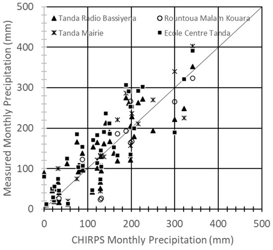 Measured monthly precipitation amounts from the four locations were compared with monthly CHIRPS data for corresponding months during years 2015 to 2021 (Figure 5). Pearson’s r was employed to evaluate the strength of the linear relationship between monthly measurements of local stations and CHIRPS. Data that plot one-to-one along a straight line with a positive slope are positively correlated (Pearson’s r = 1), while data that plot one-to-one along a straight line with a negative slope are inversely correlated or −1. Values closer to ±1 have a stronger relationship, while values closer to 0 have no strength of relationship. More detail on Pearson’s r can be found in Helsel et al. [28].