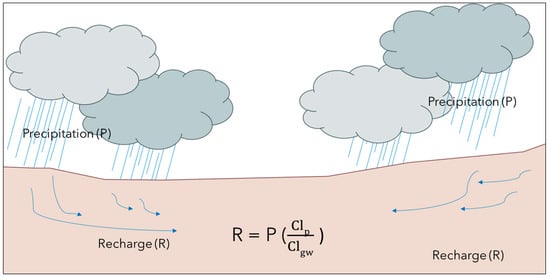 Some assumptions of the CMB include that chloride is not stored in the soil, precipitation is the only source of chloride in groundwater, and chloride is conservative in the system and does not react [31]. When these assumptions are met, recharge (R) can be estimated by calculating a ratio of the chloride measurements in precipitation and groundwater:
