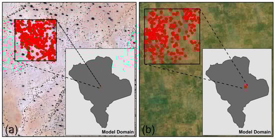 Phreatophyte ET for Sia Kouanza was estimated by making a spatial count of shrubs and trees in two randomly selected squares in the BV1b kori watershed (Figure 7). Shrubs were identified within a 250 m × 250 m square of a high-resolution Lidar flight imagery collected over the terrasse area for use in this study (Figure 7a). Trees were identified from Landsat imagery within a 1 km × 1 km square (Figure 7b). A water use rate of 1 m/yr was assumed using the estimated ET rate of mesquite in the Pahrump Valley proxy site [41].