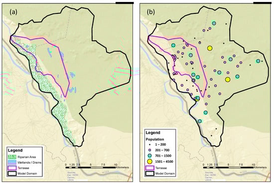 Maps showing: (a) the delineation of riparian areas (green) along the southwest boundary, which is also the river and locations of wetlands (blue) in and near the terrasse (pink) believed to be fed by groundwater; and (b) locations and populations of existing communities shown in the terrasse (outlined in pink) and larger modeling domain (outlined in black).
