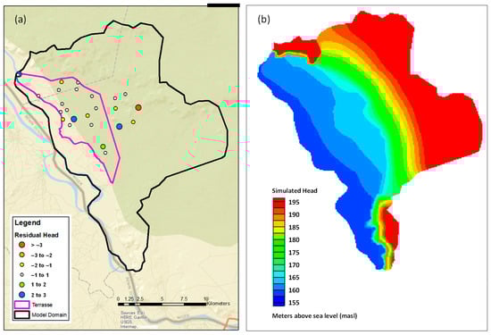 Maps showing: (a) residual head, or observed groundwater level subtracted from the simulated groundwater level, in the steady-state model where larger circles show larger differences and smaller circles show smaller differences; and (b) contours of simulated head (groundwater level) shown as meters above sea level (masl) and generally following the topography.