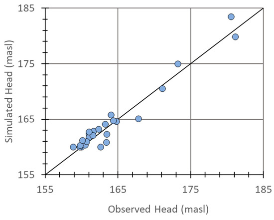 Figure 11 shows a one-to-one plot of circles that represent observed heads and the corresponding simulated heads. This type of plot can show heads as generally too high or too low and provide a sense of head distribution in a model. Below, more circles are shown clustering in the lower left corner of the plot, where head levels range from approximately 155 to 165 masl and represent the terrasse area. Head levels increase in elevation generally east of the terrasse area, and measurements are less clustered. The solid line is one-to-one; if the model were perfect, all circles would fall on the line. Though departures can be seen in the plot, there are no extreme departures or biases of heads as being generally high or low.