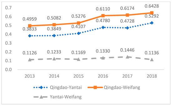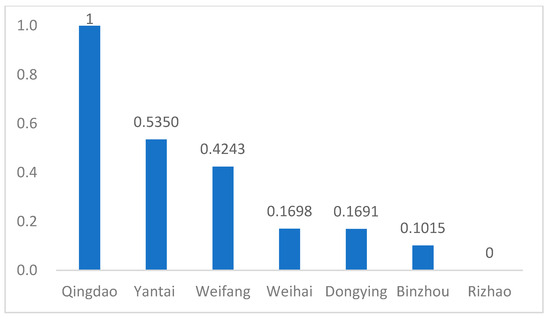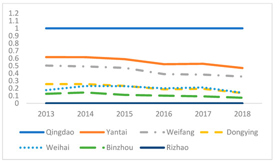 The responsible innovation performances and comprehensive performances of regions from 2013 to 2018 are shown in Table 4. The results demonstrated that (1) the ranking of regions based on comprehensive responsible innovation performance, from highest to lowest, was as follows: Qingdao, Yantai, Weifang, Weihai, Dongying, Binzhou, and Rizhao. The scores for Qingdao, Yantai, and Weifang were significantly higher than those of the other regions. The results are presented in Figure 2. (2) In view of annual changes, the comprehensive responsible innovation performances of different regions fluctuated slightly. Only Weihai began to exceed Dongying in 2016, indicating that the responsible innovation elements of Weihai were improved significantly. The trends and changes are shown in Figure 3. Weihai, in accordance with the strategic plan of building the Blue Economic Zone on the Shandong Peninsula, actively promotes the integrated development of sea and land, vigorously implements the strategy of high-end, high-quality and high-efficiency development, and focuses on introducing modern industrial organization methods such as industrial chain and value chain into the marine economy, becoming a national modernized fishery demonstration area, China’s ocean-going aquatic products processing and cold chain logistics base, China’s leisure fishery capital, and a national marine high-tech industrial base. (3) Regarding the variation trends of different regions, Figure 4 demonstrates that those with high performance extended their lead over the six-year period. The differences among the top three regions—Qingdao, Yantai, and Weifang—became more pronounced in 2018, indicating the presence of a “Matthew Effect” in regional development. Specifically, the gap between Qingdao and Yantai widened more rapidly, while the gap between Qingdao and Weifang also increased. In contrast, the gap between Yantai and Weifang remained stable. Qingdao established a more comprehensive marine industry system, and its marine industry structure was optimizing development more rapidly than in other regions. (4) In regions that rank at the bottom, such as Rizhao, Binzhou, and Dongying, responsible innovation has developed slowly. This reflects that it is necessary to increase resource input and resource integration levels to increase stocks and optimize structures, thus improving the comprehensive performance level.