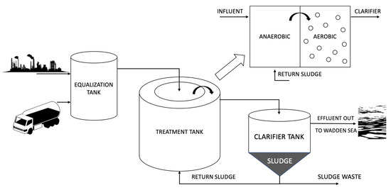 A general schematic of the biological treatment process of North Water’s SWWTP is shown in Figure 1. The influent coming from various sources is collected in the influent tank before it is pumped into the inner part of a 2-zone treatment tank, where an anaerobic biological process takes place and an aerobic process in the outer part of the treatment tank. In the clarifier tank, the activated sludge is separated from the water and is partly fed back into the treatment tank, while the treated water is then discharged into the Wadden Sea.