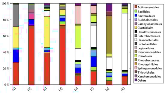 Stacked bar chart of microbial communities showing the populations in order for a few samples, where (a–d) are R1 samples while (e–h) are R2 samples. Samples (a,e) were taken on day 8, samples (b,f) were taken on day 15, samples (c,g) were taken on day 43, and samples (d,h) were taken on day 53.
