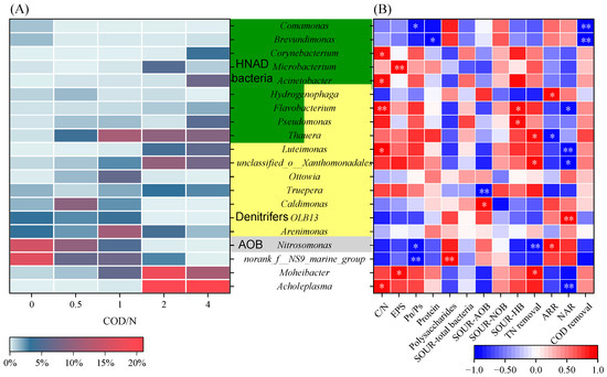 (A) Relative abundances of bacterial communities at the genus level across different COD/N ratios. (B) Pearson’s correlation between bacterial communities and performance/sludge properties at varying COD/N ratios. The color key represents the strength of the correlation coefficient, with significant correlations denoted by * (p < 0.05) and ** (p < 0.01).