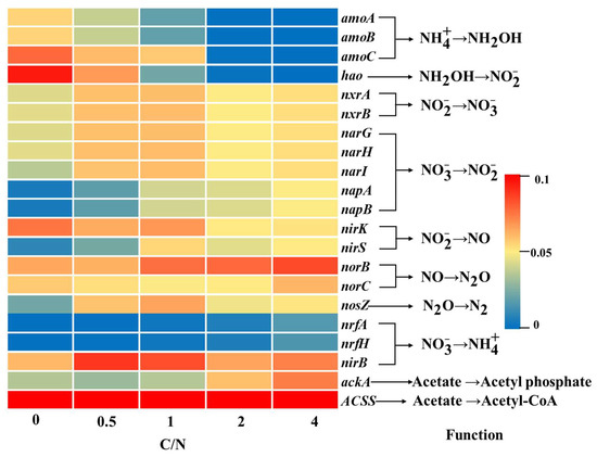 The relative abundance of functional genes related to the nitrogen cycle and carbon fixation at different COD/N ratios was analyzed based on the PICRUSt prediction in the KEGG database. The results are shown in Figure 6. Those genes are associated with nitrification, denitrification, and dissimilatory nitrate reduction to ammonium (DNRA). For the PN process, amoA, amoB, amoC, and hao are the four main genes, of which the amoA, amoB, and amoC genes encode ammonia monooxygenase. This enzyme converts ammonia to hydroxylamine. The hao gene encodes a hydroxylamine oxidase, which further transforms hydroxylamine into nitrite. The total relative abundance of those four genes decreased as the COD/N ratios increased, which was consistent with the declined PN performance with the increase in COD/N ratios. In addition, the nxrA and nxrB genes encode nitrite oxidase, which converts nitrite to nitrate. The total relative abundance of these two genes increased as the COD/N ratios increased from 0 to 1, while they decreased when the COD/N ratios were 2 and 4. A similar variation was observed in the denitrification-associated genes (narG, narH, narI, nirK, nirS, norB, norC and nosZ), except for the napA and napB genes. Furthermore, the genes involved in DNRA include nrfA, nrfH, and nirB. These genes are crucial in the conversion of nitrite to ammonium. Specifically, the nrfA and nrfH genes encode periplasmic nitrite reductase, while nirB encodes for the cytoplasmic NADH-dependent nitrite reductase [34]. There was an interesting phenomenon whereby the variation in these genes showed a similar trend to that in denitrification, which was the highest at a COD/N ratio of 1.