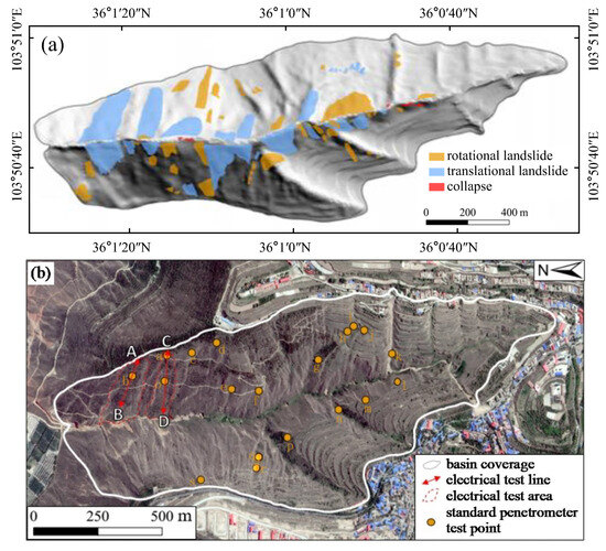 (a) The distribution of the landslides; (b) Thickness measurements using a standard penetrometer and high-density electrical method; The uppercase letters A to D are the boundaries of the electrical test line; The lowercase letters a to s are the standard penetrometer test point, respectively.