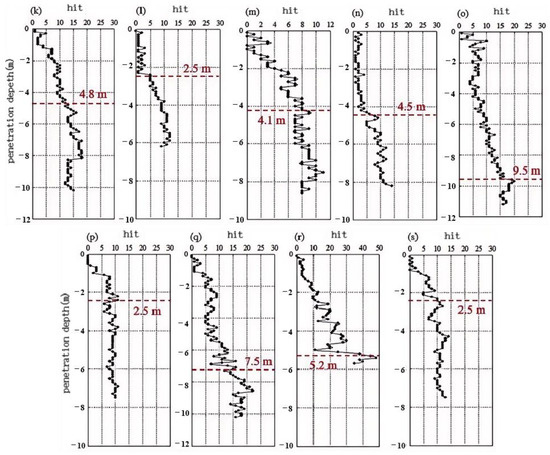 The measuring results of the hit numbers and penetration depth for the 19 selected landslides. (a–s) are the serial number of the penetrometer test point, respectively.