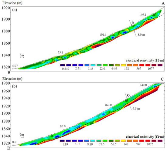 The measuring results of the high-density electrical method: (a) Section A–B; (b) Section C–D.