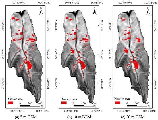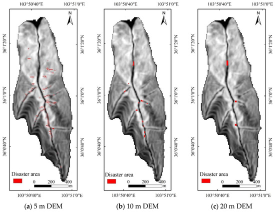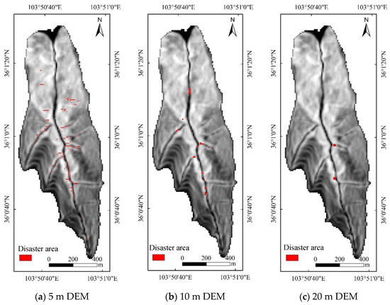 Disaster area distributions under landslide-induced debris flow conditions identified in DEM data at different resolutions.