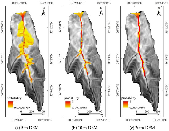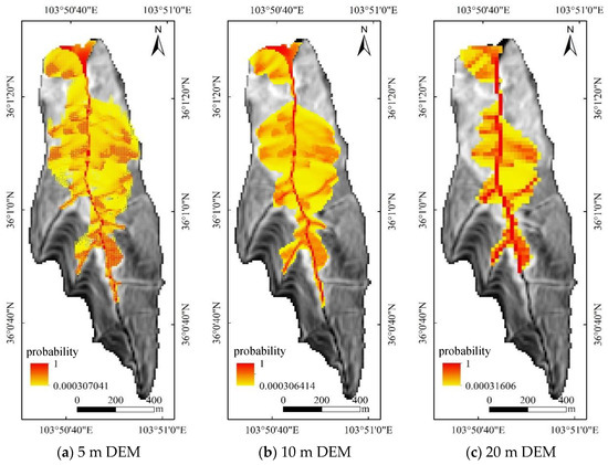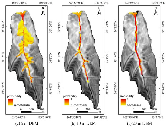 DEM data with different resolutions were selected to analyze the ability of DEM data to identify potential source areas. DEM data with 5 m, 10 m, and 20 m resolutions at the watershed scale of the Laolang gully were selected, and the same source-area identification criteria and motion-diffusion parameters were used. Hazard evaluations under four different conditions, namely, flood, collapse-affected debris flow, landslide-affected debris flow, and debris flow under the simultaneous influence of landslide and collapse, were analyzed at different topographic resolutions.