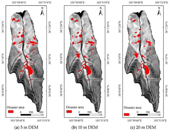 Disaster area distributions under the simultaneous influence of collapse and landslide conditions identified in DEM data at different resolutions.