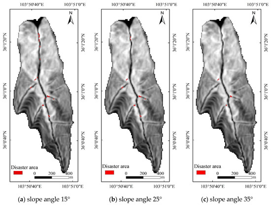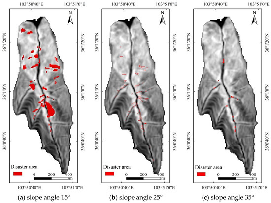 Disaster area distributions under the simultaneous influence of collapse and landslide conditions at different critical slope thresholds.
